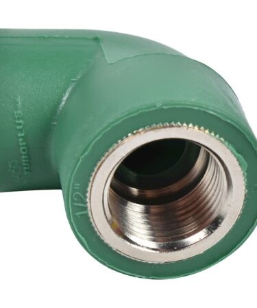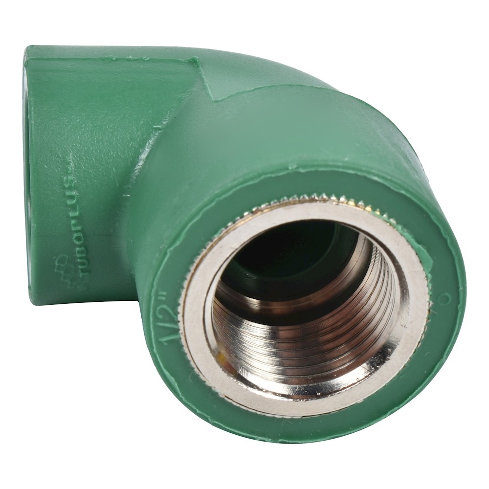Codo hembra de 90 grados verde Tuboplus, es funcional para realizar la unión de la tubería de 2 cm de diámetro y conexión tipo macho de 1/2 pulgada en instalaciones hidráulicas del hogar. Elaborada en polipropileno random (PP-R) y metal.